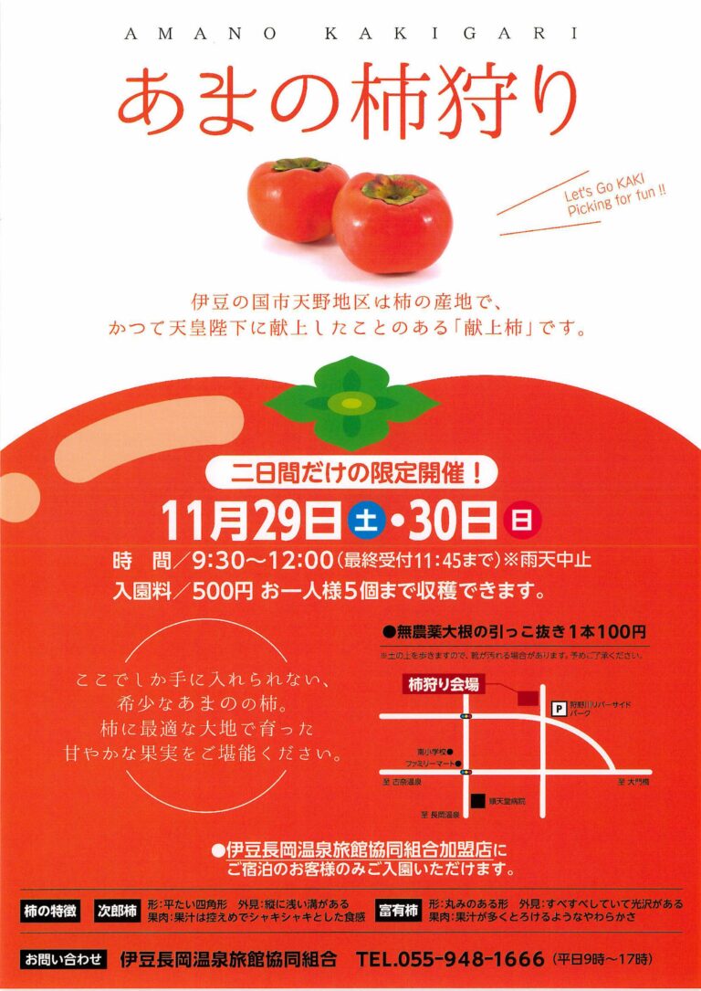 今年も伊豆長岡温泉宿泊限定の企画が開催されます。 伊豆長岡温泉旅館組合に加盟している旅館・ホテルに宿泊された方限定の企画です。 11月29日(土)、30日(日)の2日間、伊豆長岡温泉にご宿泊のお客様を対象にあまの柿狩りが […]